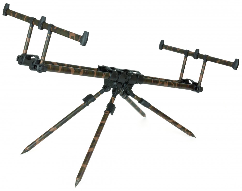 A közkedvelt Fox Ranger MK2 rod pod Camo változata. Lehetőség van a normál Ranger lábak helyett akár quad pod beállításra is (4 lábas tripod) a lábak középre tolásával és a mellékelt speciális alátétek használatával. Mindössze 2.5 fordulattal rögzíthetők a lábak. Mindegyik láb hat pozícióban rögzíthető, így igazán sokoldalúnak mondható. Teljes hosszban cipzáras hordtáskával, mely nagy elülső zsebbel rendelkezik. Tökéletes mindenféle terepre és vízre akár a legnagyobb tavakon és folyókon is használható.